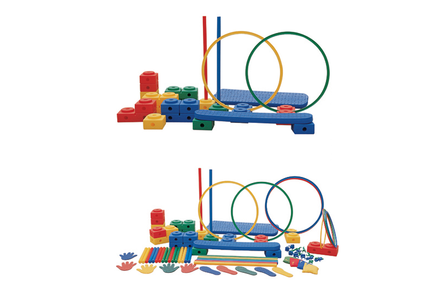 内容组件:半转12块,全砖8块,平衡桥4片,35cm体能棒16只,70cm体能棒8只,棒夹12只,环夹12个,豆袋10个,彩色手脚印各6对,使用指导手册1本